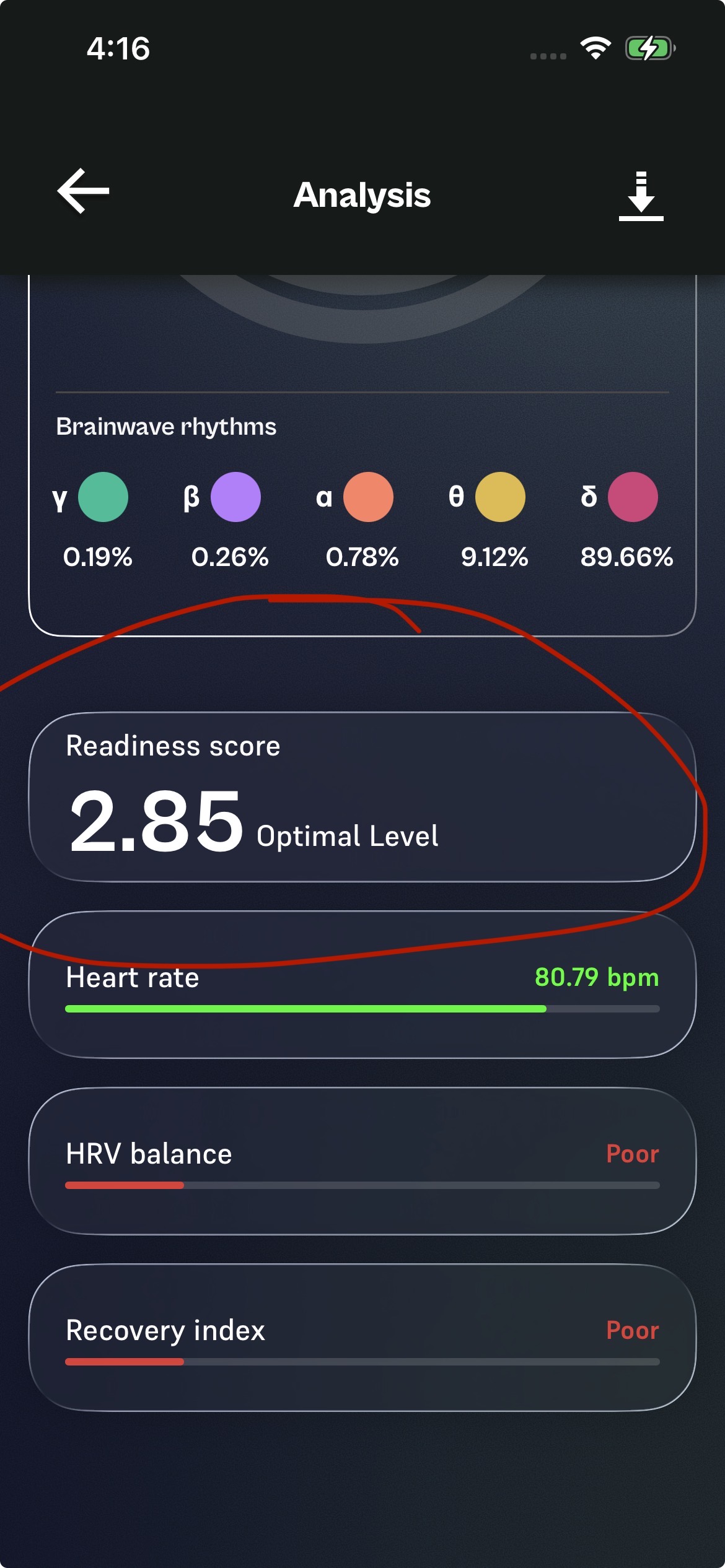 When navigating from History → Individual Therapy → Analysis screen, the UI displays the labels “Readiness Score” and “Optimal Level.”