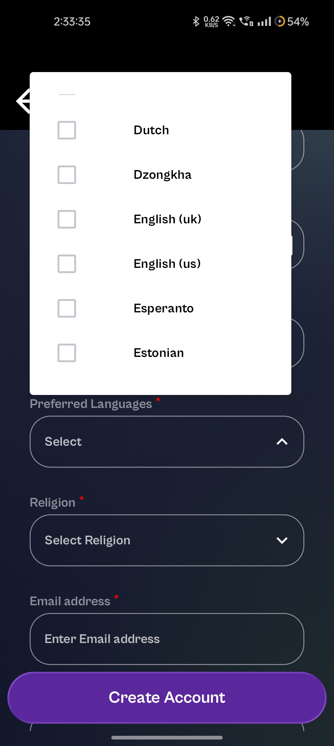 openIn the Create Account section, the Preferred Language dropdown displays English (us) and English (uk). The correct format should be English (US) and English (UK).