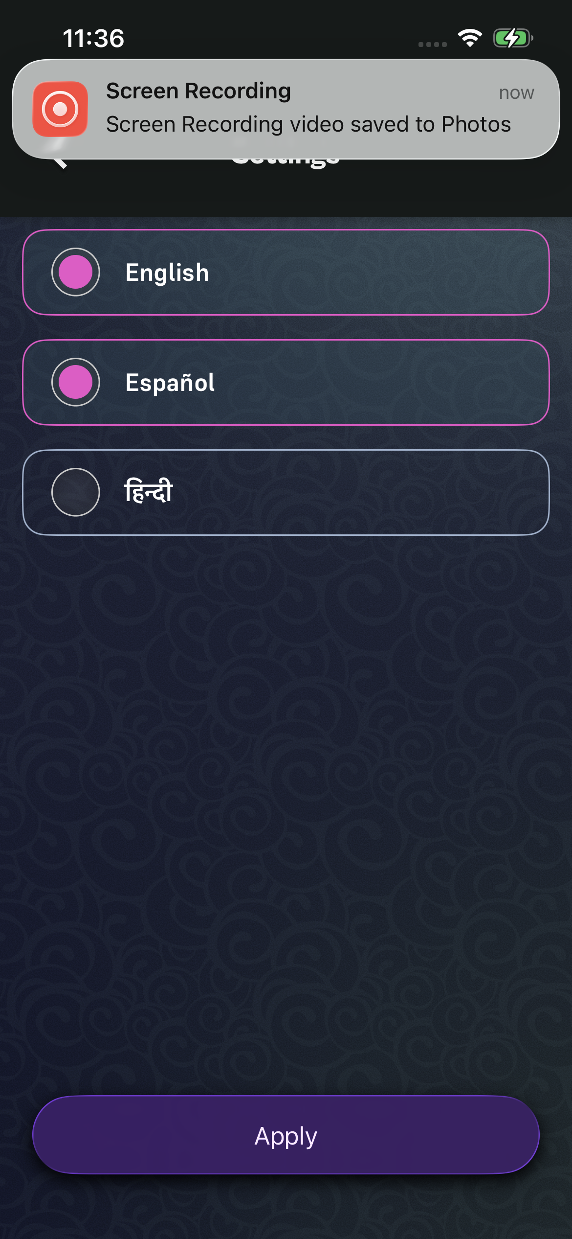 openLanguage settings show both English and Español selected initially(version 1.93)
