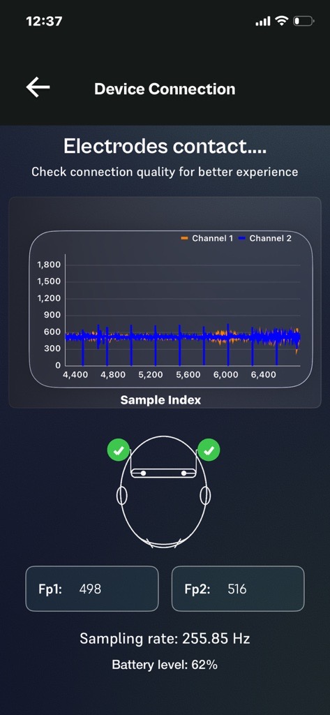On the device connection screen, the graphs X and Y axes are not defined properly, making the EEG signal representation unclear.